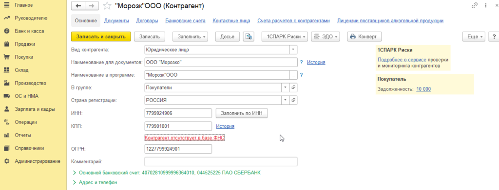 Запишите созданного вами контрагента, после того, как вы заполнили и проверили все реквизиты.