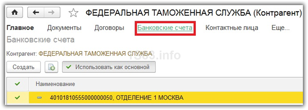 Если перейти в карточке контрагента по гиперссылке «Банковские счета», мы увидим, что наш счет автоматически туда добавился и установился в качестве основного. В этот список можно добавить еще и другие счета.