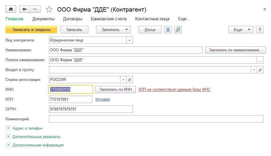 Обратите внимание, что при вводе ИНН и КПП программа осуществляет их проверку. В том случае, если в программе уже заведен контрагент с такими реквизитами, вам будет об этом сообщено