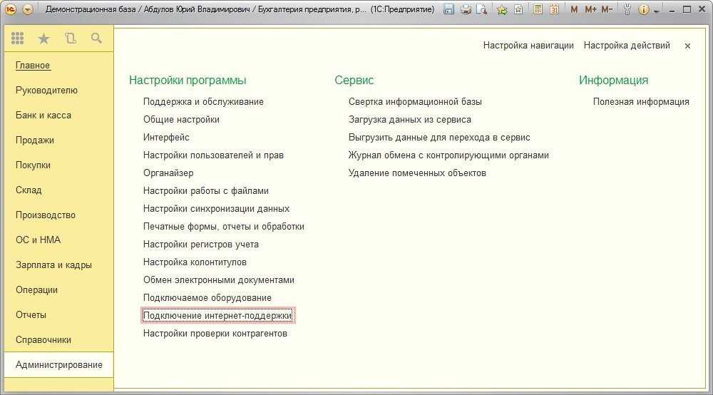 Чтобы пользователь имел доступ к сервису автоматического заполнения реквизитов контрагентов, ему необходимо подключить интернет-поддержку. Подключение интернет-поддержки осуществляется по одноименной гиперссылке из раздела Администрирование (рис. 4а, 4б).
