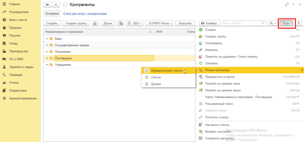 Перед тем как вносить в базу нового контрагента, нужно проверить его наличие в справочнике «Контрагенты«. Этот справочник имеет 3 режима просмотра: