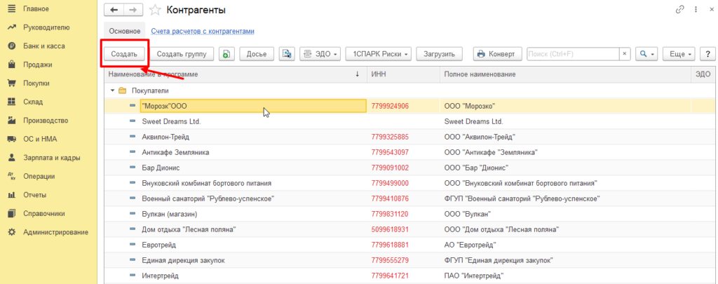 В форме списка контрагентов так же для удобства реализована автоматическая проверка на наличие в базе ФНС. ИНН не найденных контрагентов будут подсвечиваться красным.