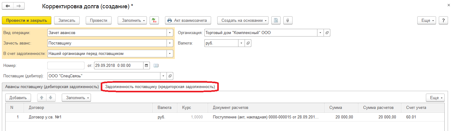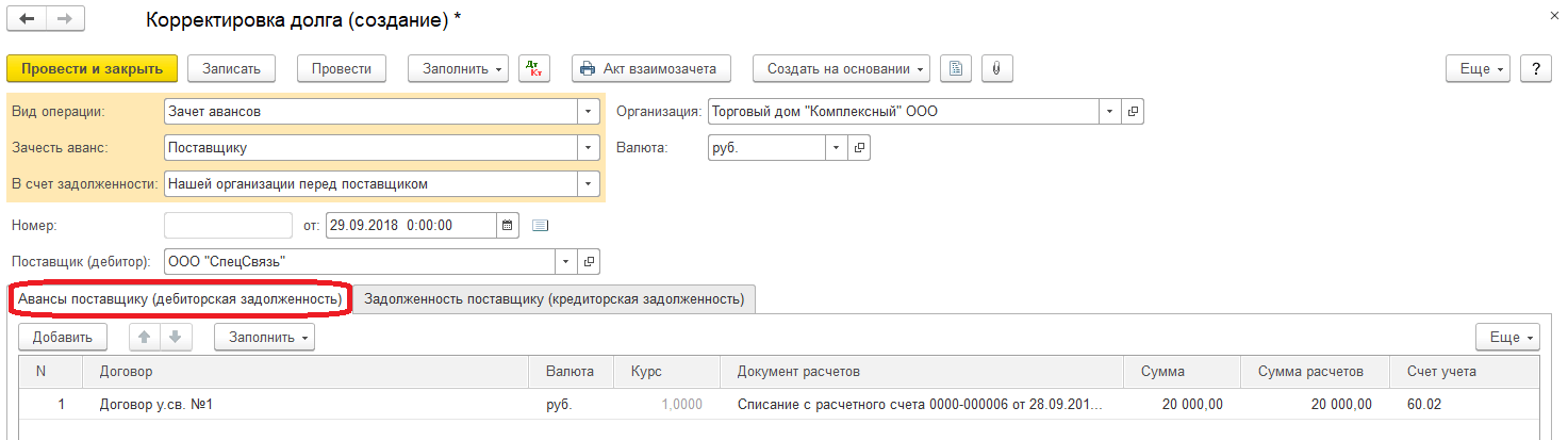 . Это позволит закрыть задолженность по документу расчетов или определить новую сумму возникшего аванса вследствие переплаты.