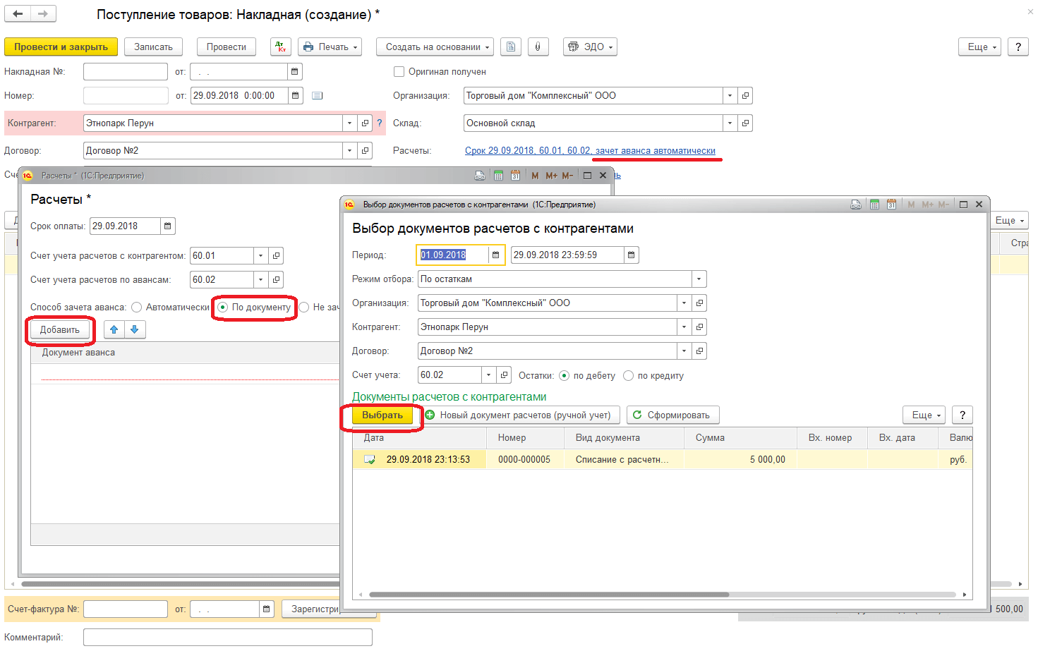 Первый вариант “Автоматически”. В данном случае выданные (полученные) авансы, согласно договору, будут зачтены документом поступления (реализации). Данный вариант удобен в том случае, если расчеты ведутся по договору в целом, а не по конкретным счетам или документам поступления (реализации).