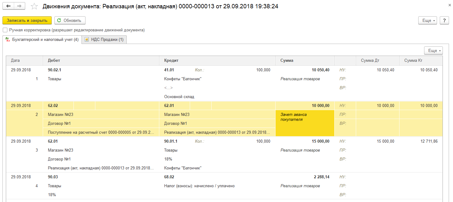 К примеру, от покупателя ООО «Магазин №23» поступил аванс в размере 10 тыс. рублей на указанный расчетный счет организации Торговый дом «Комплексный» ООО по Договору №1. После чего мы реализовали продукцию на сумму 15 тыс. рублей.
