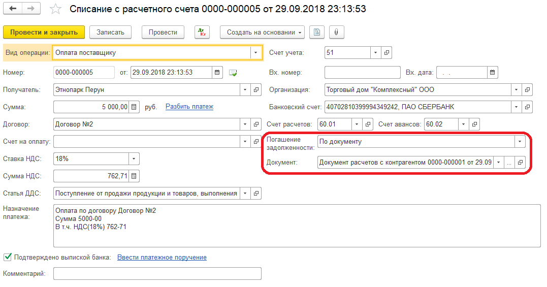 В данном случае рассмотрим такую ситуацию. Наша организация Торговый дом «Комплексный» ООО перечислила аванс в размере 5 тыс. рублей поставщику товаров ООО Этнопарк «Перун» по Договору №2 и конкретному документу расчетов с контрагентом. После чего товар был получен от контрагента. Оформим данные операции в программе.