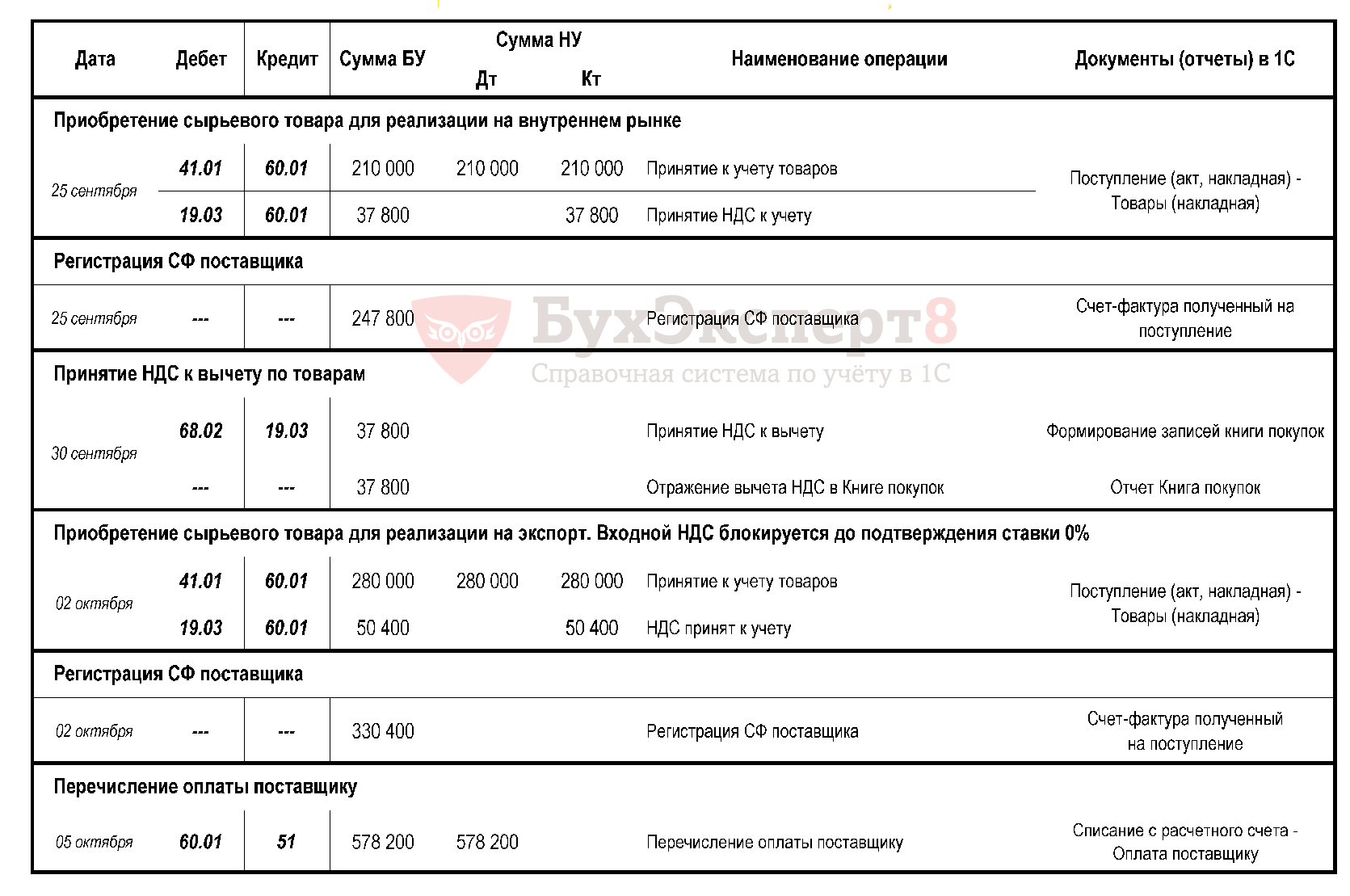 - Блокируется до подтверждения 0% — учет входящего НДС только для операций по ставке 0%, по которым требуется ее подтверждение (экспорт сырьевых товаров, работы, услуги);