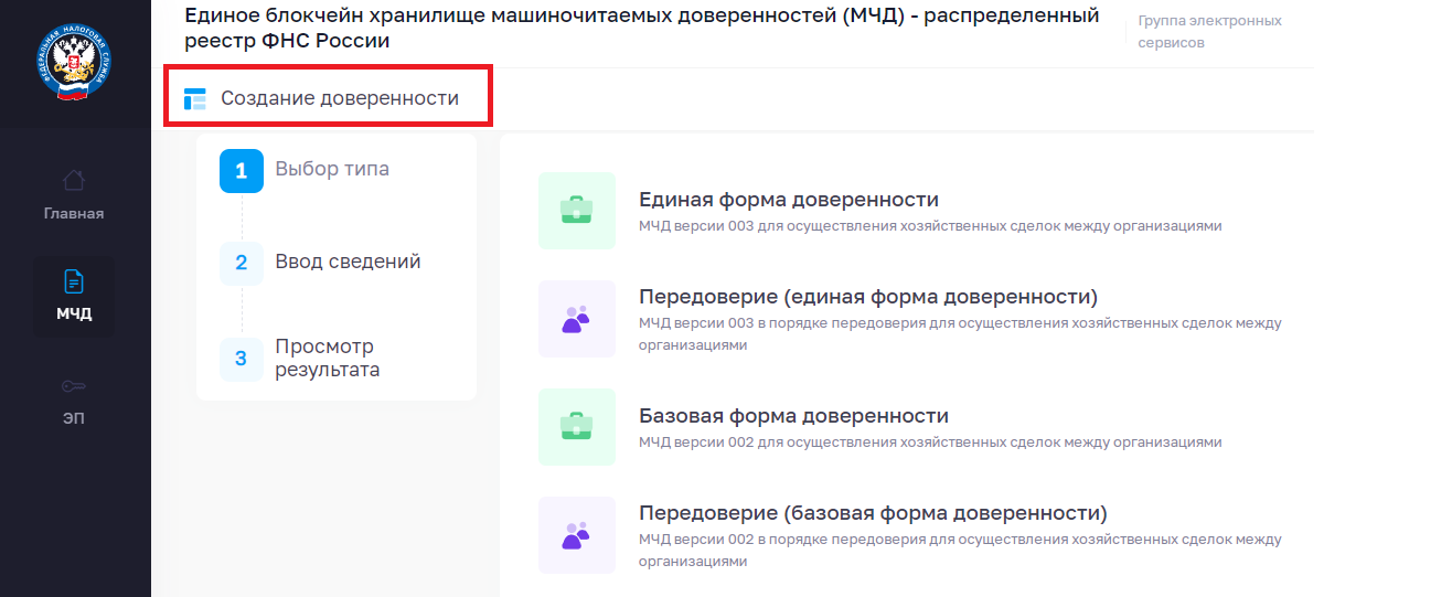 В этом случае электронная доверенность оформляется в специальном сервисе на сайте ФНС.