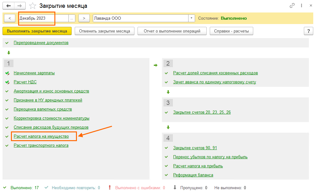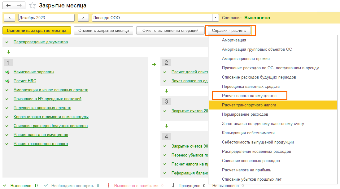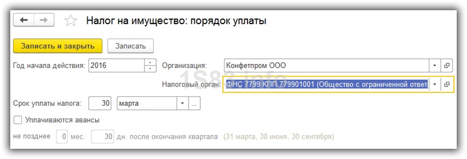 Производится при закрытии месяца в ходе выполнения регламентной операцией в декабре Расчет налога на имущество (Операции – Закрытие месяца). Если в настройке Уплата авансовых платежей в настройке налогов и отчетов установлена галка, что уплачиваются авансы по налогу на имущество, то регламентная операция по расчету налога будет не только в декабре, но и в марте, июне и сентябре