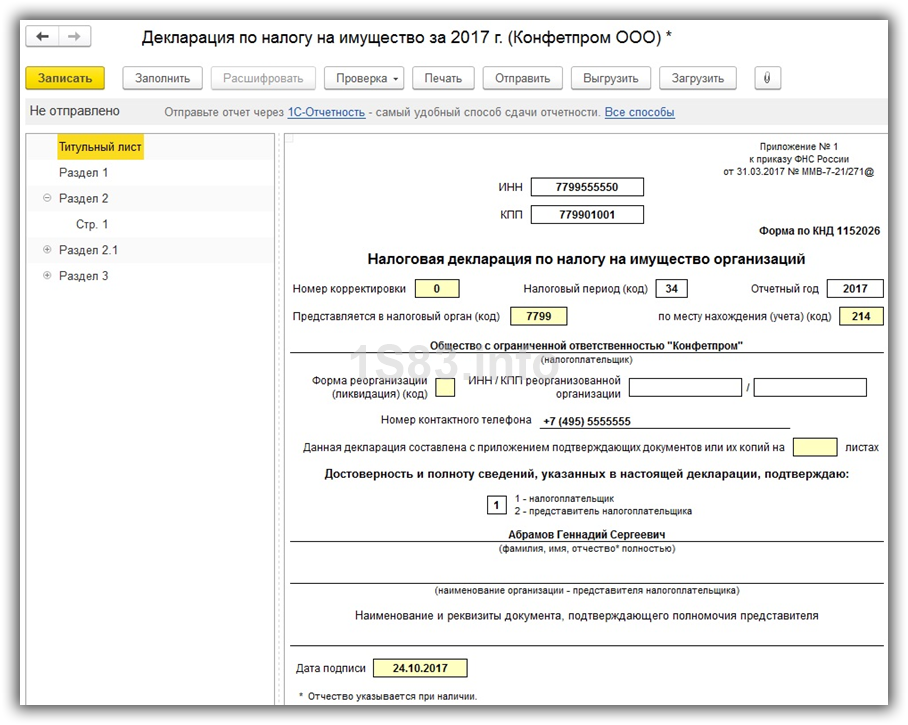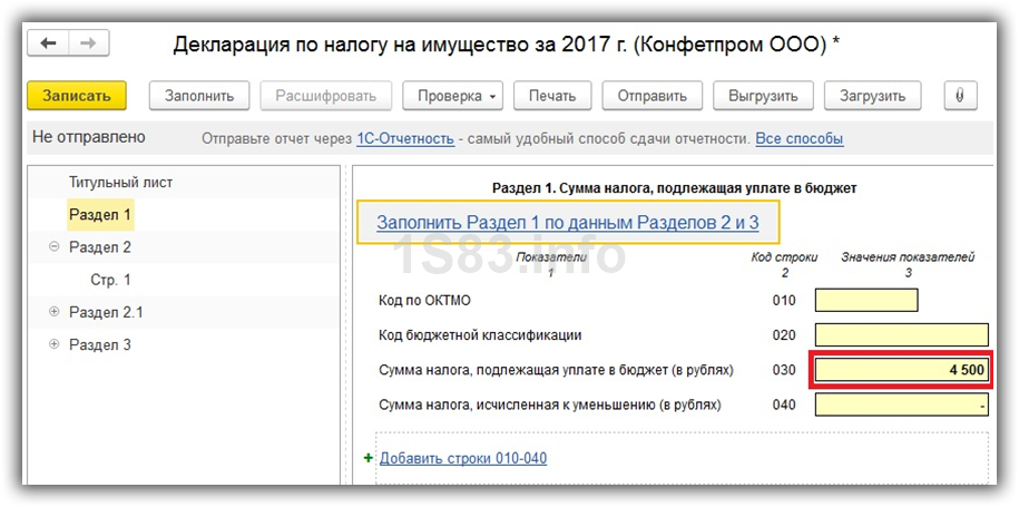 По данным раздела 2 и 3 (заполняется для недвижимости) заполняется раздел 1. В нашем случае ООО «Конфетпром» не имеет в собственности недвижимости, поэтому налог на имущество к оплате будет составлять всего 4 500 рублей. В данной сумме учтен ранее уплаченный аванс.