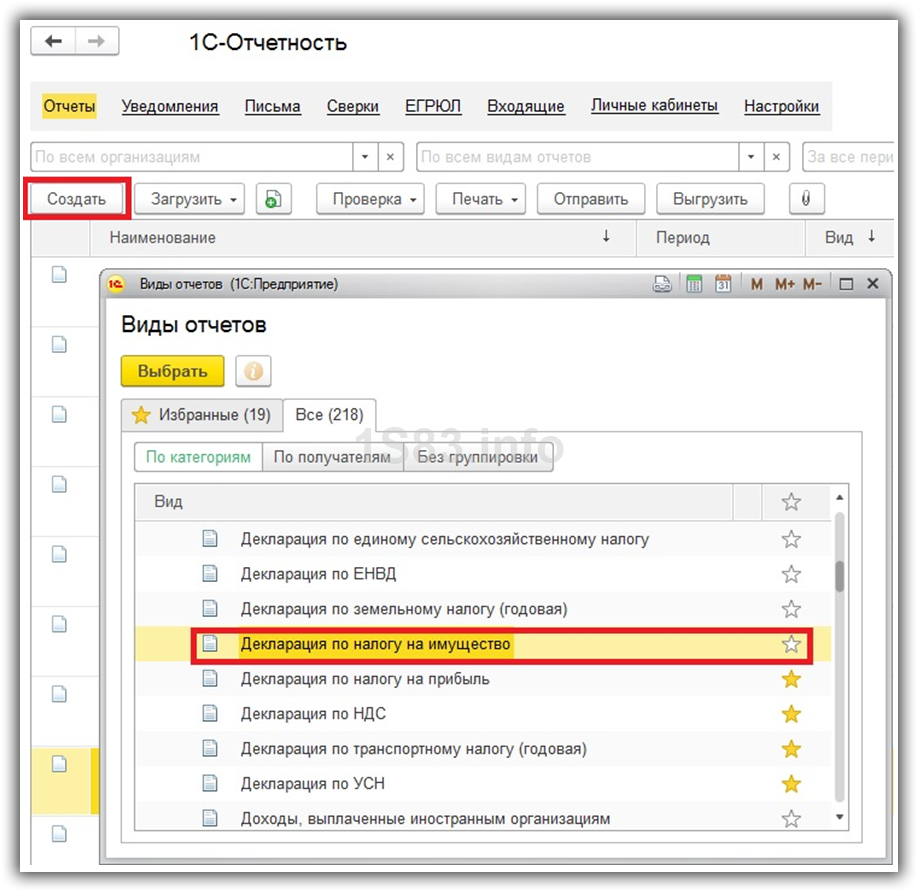 Нажмите на кнопку «Создать» и в открывшемся окне перейдите на вкладку «Все», если данная декларация не добавлена вами в избранное. Декларация по налогу на имущество расположена в папке «Налоговая отчетность».