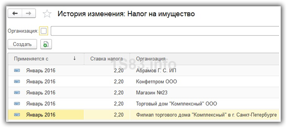 В данном разделе отражены все изменения констант для расчета налога на имущество с указанием периода их действия. В нашем примере в программе ведется учет сразу по нескольким организациям, поэтому для каждой своя строка с настройкой.