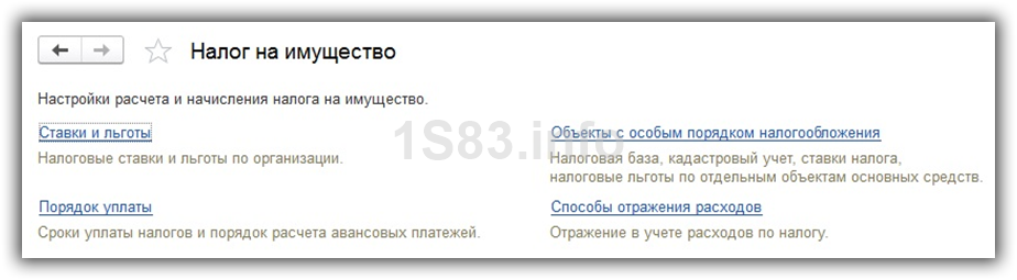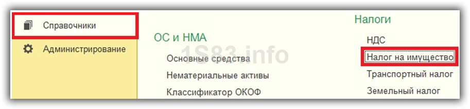 В разделе программы «Справочники» находится пункт в 1С «Налог на имущество». Именно здесь вносятся все постоянные данные для расчета налога.