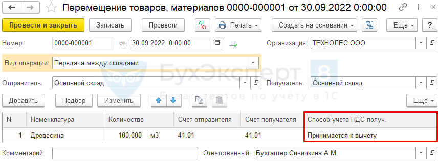 Шаг 1. Измените Способ учета НДС документом Перемещение товаров в разделе Склад.