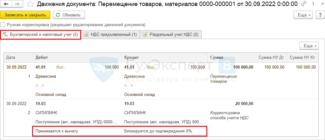 После проведения в документе сформируется проводка Дт 19 Кт 19 и корректировка Способа учета НДС.