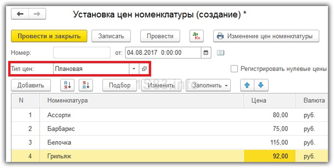 Ранее мы создавали документ установки цен. Тип цен вы должны были создать самостоятельно, задав произвольное имя. Теперь мы должны указать, что именно созданный тип цен является плановым.