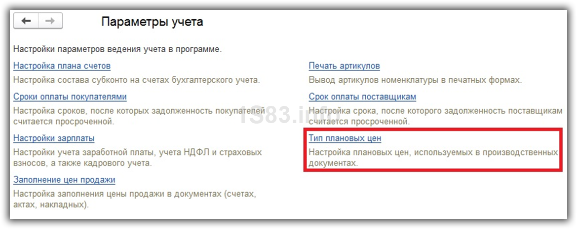 Перейдите в параметры учета, которые находятся так же в разделе «Главное». Далее, в открывшемся окне перейдите по гиперссылке «Тип плановых цен».