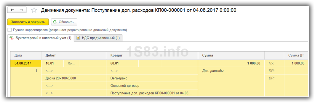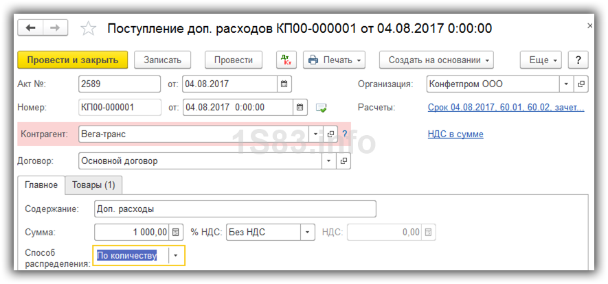 В рамках нашего примера мы распределили дополнительные расходы только на доски, но вы можете указать несколько различных товаров на одноименной вкладке документа. В таком случае указанная сумма дополнительного расхода распределится по всем товарам. Распределение будет производиться либо «По количеству» либо «По сумме» (указывается на вкладке «Главное» данного документа).