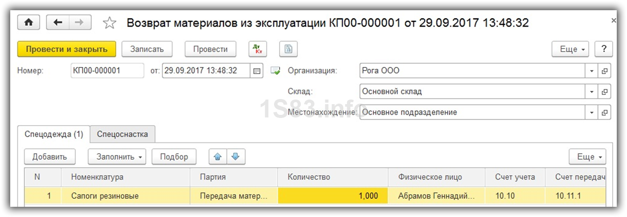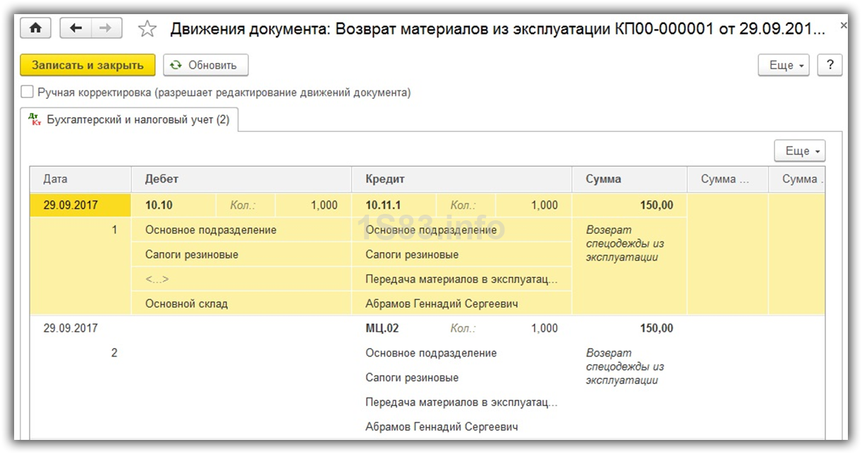 После проведения документа мы видим, что со счета МЦ.02 списана одна пара стоимостью 150 рублей. Счет учета сапог изменился с 10.11.1 (в эксплуатации) на 10.10 (на складе).