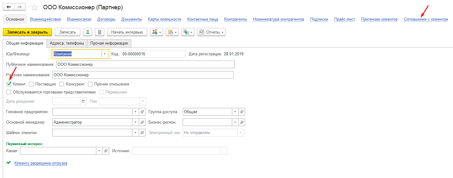 Создайте в программе 1С:Управление торговалей комиссионера с типом «Клиент».
