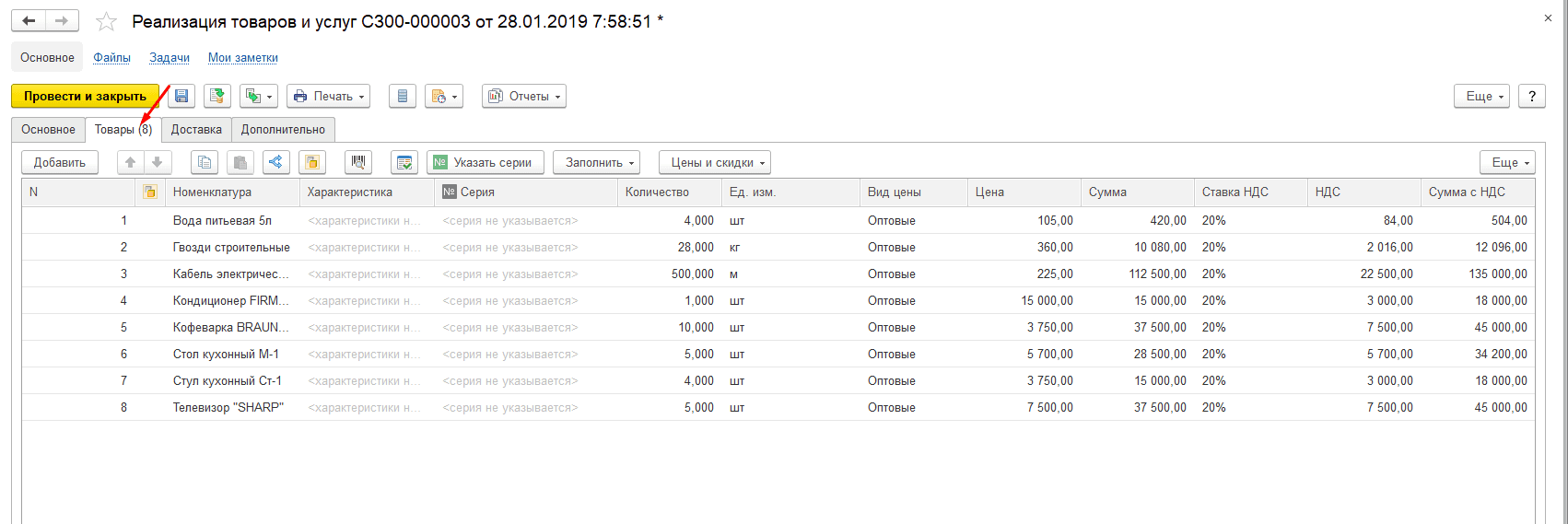 Заполните вкладку Товары.