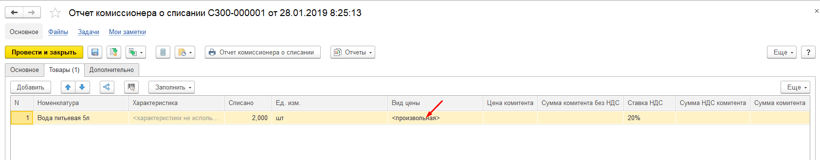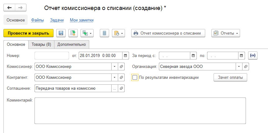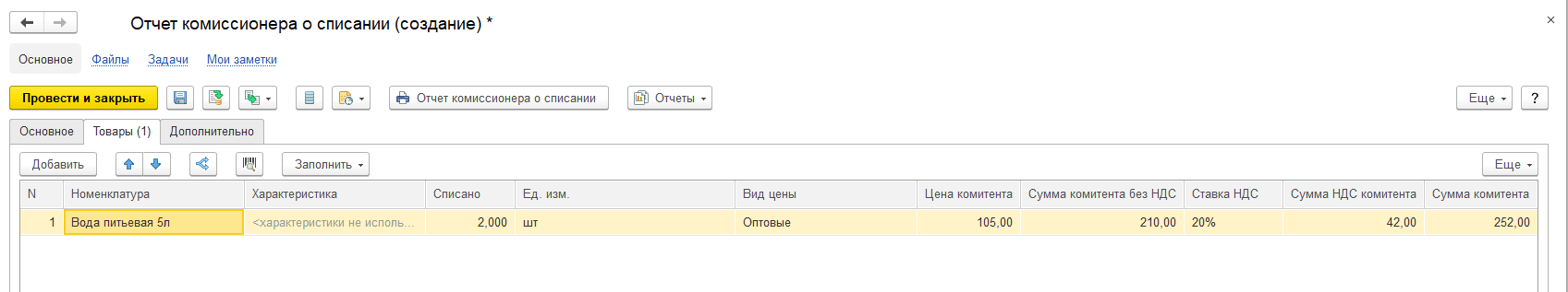 Документ заполняется автоматически. Флажок По результатам инвентаризации свидетельствует, что комиссионер отчитывается не о том, сколько товаров он продал / списал, а отправляет данные об общем остатке комиссионного товара, а количество проданного/списанного рассчитывается автоматически (в примере мы не используем эту возможность).