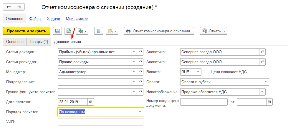 На последней вкладке укажите статьи доходов и расходов, порядок расчетов и заполните остальные поля. Дата платежа – дата, когда комиссионер заплатит за товар, списанный по данному отчету.
