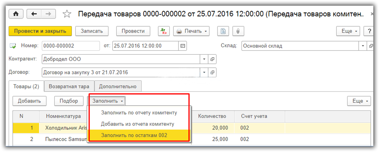 Для отражения этой операции в 1С 8.3 существует специальный документ. Он доступен в разделе «Покупки», подраздел «Покупки» – Передача товаров комитенту. Создадим новый документ. В шапке укажем комитента и договор. В табличную часть заносятся переданные товары. Здесь возможно автозаполнение, по кнопке «Заполнить».