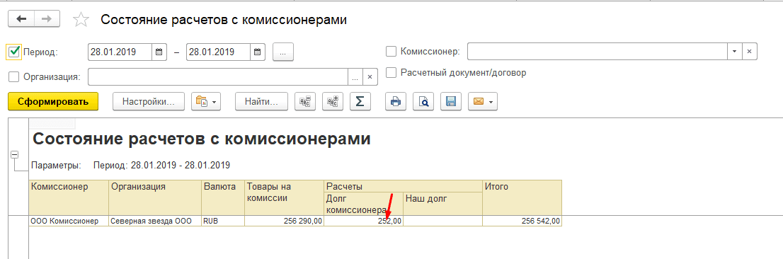 После проведения отчета комиссионера у партнера образуется долг.