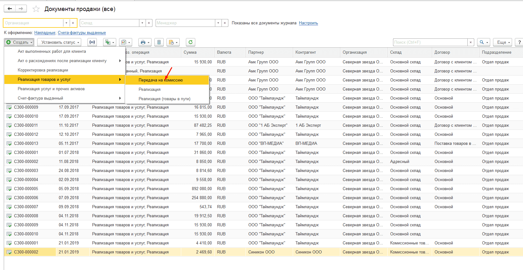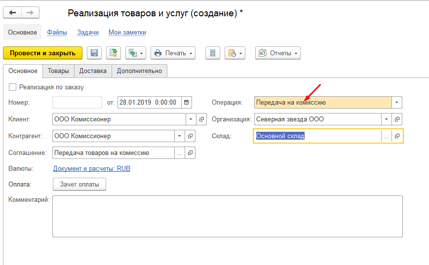 Теперь нужно передать товары комиссионеру. Создайте документ Реализация товаров и услуг.