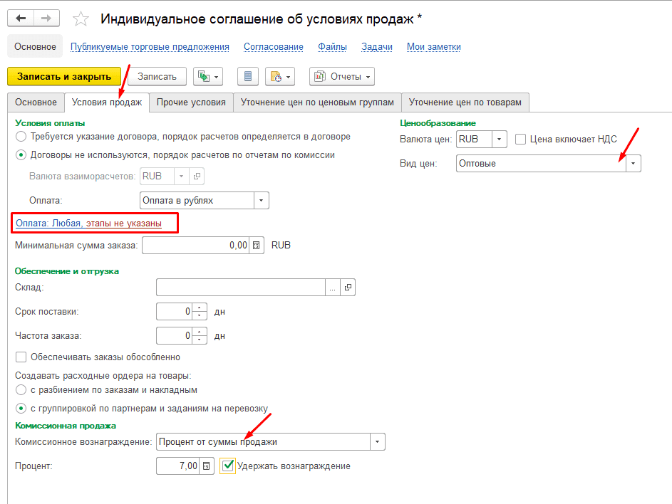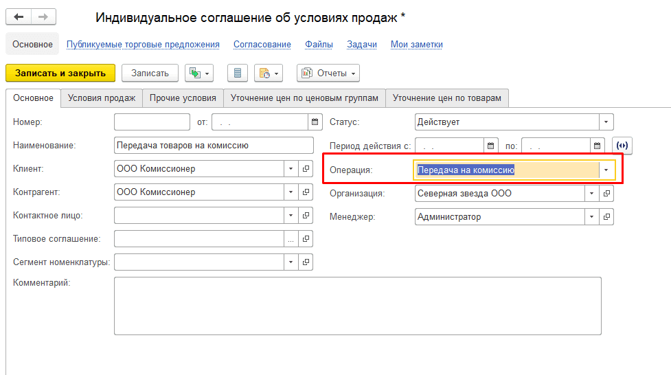 Комиссионные продажи работают, только если включены соглашения. Можно использовать одно типовое соглашение со всеми комиссионерами или индивидуальные.