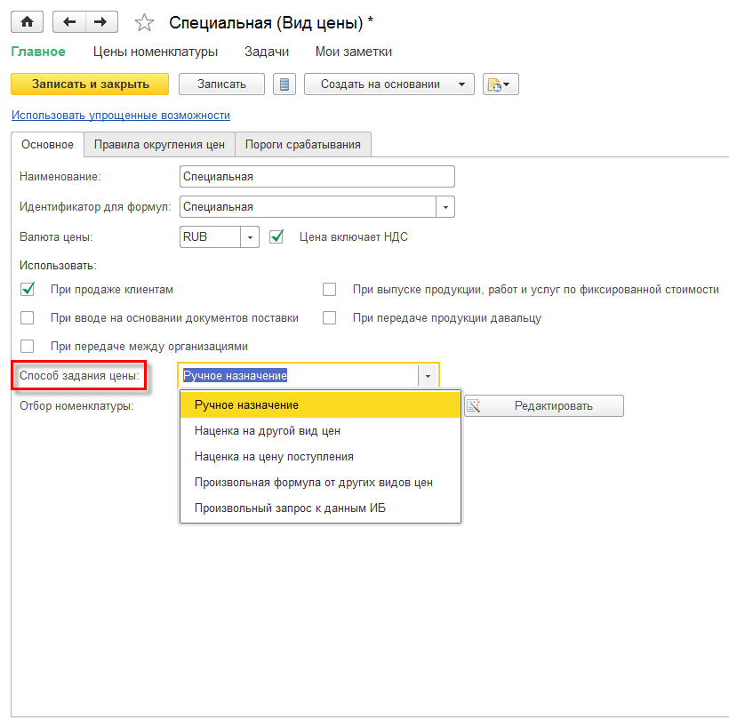 В случае использования различных видов цен на товары можно для каждого вида устанавливать свои цены, правила расчета, методы округления, валюту и т.д. Для этого нужно настроить свои правила для каждого вида цен (способы задания цены).