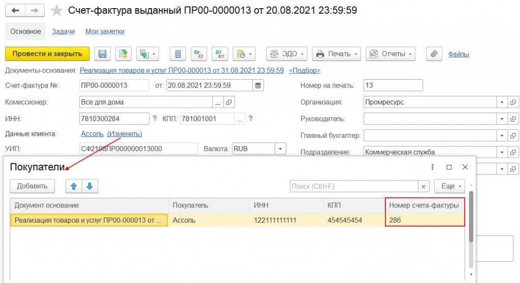 По данным документа Реализация товаров и услуг с типом операции Реализация через комиссионера оформляется документ Счет-фактура выданный.