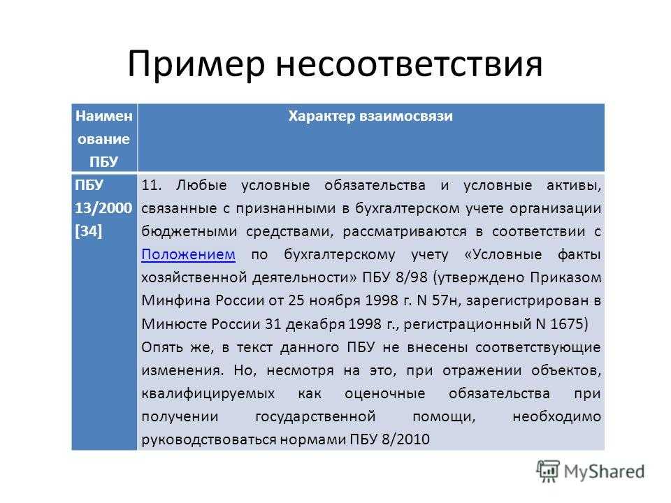 Пример несоответствия Наимен ование ПБУ Характер взаимосвязи ПБУ 13/2000 11. Любые условные обязательства и условные активы, связанные с признанными в бухгалтерском учете организации бюджетными средствами, рассматриваются в соответствии с Положением по бухгалтерскому учету «Условные факты хозяйственной деятельности» ПБУ 8/98 (утверждено Приказом Минфина России от 25 ноября 1998 г. N 57н, зарегистрирован в Минюсте России 31 декабря 1998 г., регистрационный N 1675) Положением Опять же, в текст данного ПБУ не внесены соответствующие изменения. Но, несмотря на это, при отражении объектов, квалифицируемых как оценочные обязательства при получении государственной помощи, необходимо руководствоваться нормами ПБУ 8/2010