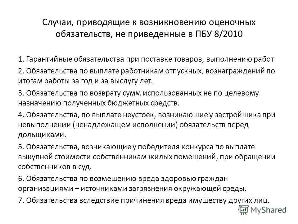 Случаи, приводящие к возникновению оценочных обязательств, не приведенные в ПБУ 8/ Гарантийные обязательства при поставке товаров, выполнению работ 2. Обязательства по выплате работникам отпускных, вознаграждений по итогам работы за год и за выслугу лет. 3. Обязательства по возврату сумм использованных не по целевому назначению полученных бюджетных средств. 4. Обязательства, по выплате неустоек, возникающие у застройщика при невыполнении (ненадлежащем исполнении) обязательств перед дольщиками. 5. Обязательства, возникающие у победителя конкурса по выплате выкупной стоимости собственникам жилых помещений, при обращении собственников в суд. 6. Обязательства по возмещению вреда здоровью граждан организациями – источниками загрязнения окружающей среды. 7. Обязательства вследствие причинения вреда имуществу других лиц.