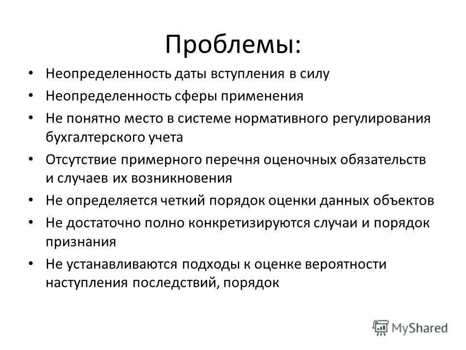 Проблемы: Неопределенность даты вступления в силу Неопределенность сферы применения Не понятно место в системе нормативного регулирования бухгалтерского учета Отсутствие примерного перечня оценочных обязательств и случаев их возникновения Не определяется четкий порядок оценки данных объектов Не достаточно полно конкретизируются случаи и порядок признания Не устанавливаются подходы к оценке вероятности наступления последствий, порядок