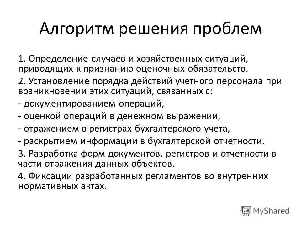 Алгоритм решения проблем 1. Определение случаев и хозяйственных ситуаций, приводящих к признанию оценочных обязательств. 2. Установление порядка действий учетного персонала при возникновении этих ситуаций, связанных с: — документированием операций, — оценкой операций в денежном выражении, — отражением в регистрах бухгалтерского учета, — раскрытием информации в бухгалтерской отчетности. 3. Разработка форм документов, регистров и отчетности в части отражения данных объектов. 4. Фиксации разработанных регламентов во внутренних нормативных актах.