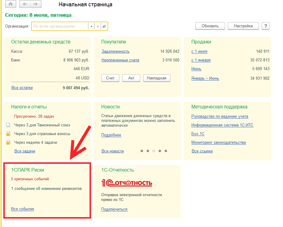 В программе «1С:Бухгалтерия предприятия ред. 3.0» на начальной странице отображается блок «1СПАРК Риски»: