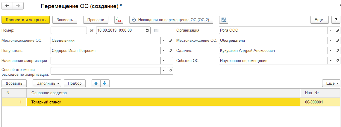 Там следует отмечать информацию лишь в том случае, если после перемещения начисляется дополнительная амортизация. В примере на скрине мы не будем их заполнять. Амортизация, по обыкновению, начисляется по завершении месяца.