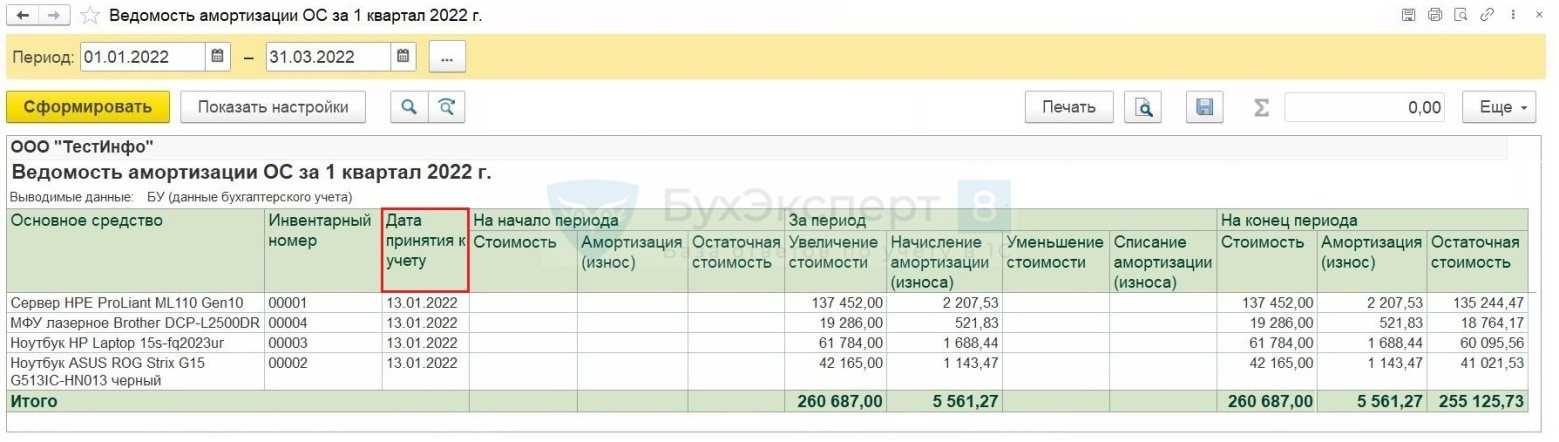 Ведомость амортизации можно настроить для получения дополнительной информации. Например, вывести дату принятия к учету или местонахождение основного средства.