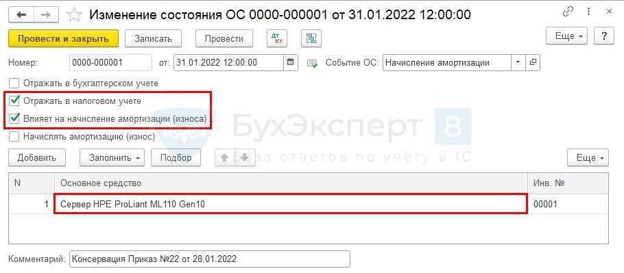 Чтобы законсервировать ОС только в НУ, воспользуйтесь документом Изменение состояния ОС (раздел ОС и НМА). Создайте документ, в поле Событие ОС в предложенном списке выберите событие, которое отражаете.
