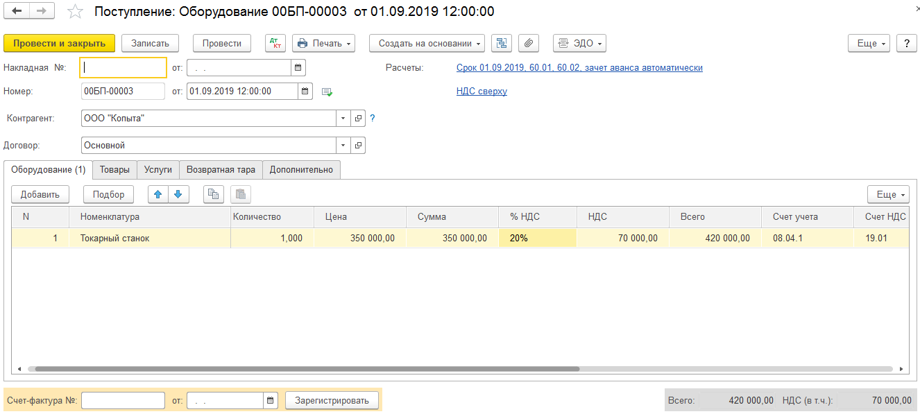 Требуется провести регистрацию счета-фактуры, полученной от поставщика. Ее проведение должно быть проведено только после того, как оборудование будет оприходовано на склад.