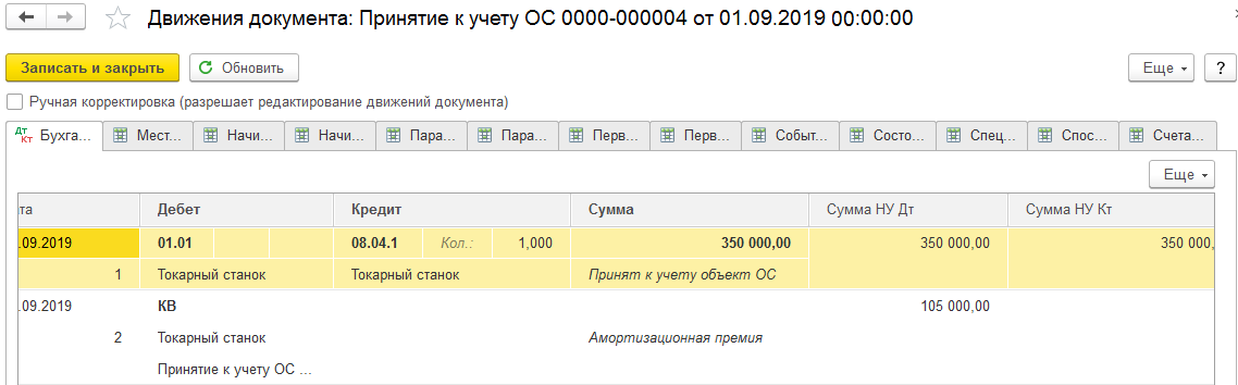 В первой проводке будет само принятие нашего станка к учёту с отметкой суммы (триста пятьдесят тысяч рублей). Во второй же строке движений будет отмечена амортизационная премия в 30% — по деньгам получается сто пять тысяч рублей.