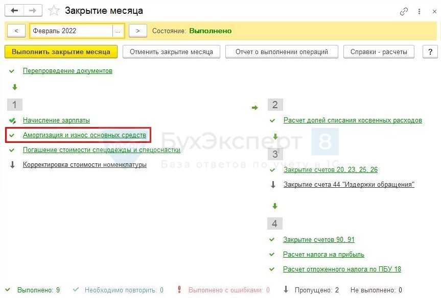 Для её выполнения переходим в меню «Операции», потом к «Закрытию месяца». Выбираем период, нашу компанию. Далее всё уже подробно автоматизировано. Расчёты помощник делает последовательно и сперва считает амортизационные отчисления. Если всё было выполнено безошибочно, то произведётся создание документа амортизации, как на скрине.