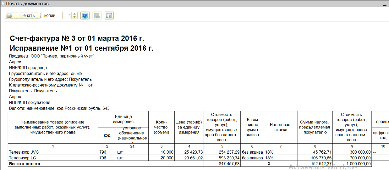 Не забываем сформировать счет-фактуру. Она получается такого вида: