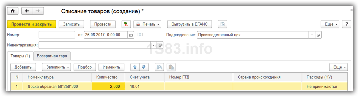 В табличной части на вкладке материалы перечислите все те, которые нужно списать с указанием их количества. Списываемые материалы должны быть в наличии на счете 10.
