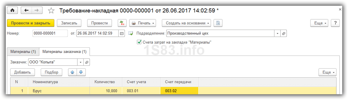 Для отражения списания материалов заказчика по давальческой схеме в 1С перейдите на соответствующую вкладку данного документа. На ней укажите заказчика, и добавить нужные номенклатурные позиции с указанием их количества в табличную часть. и передачи заполнятся автоматически (003.01 и 003.02).