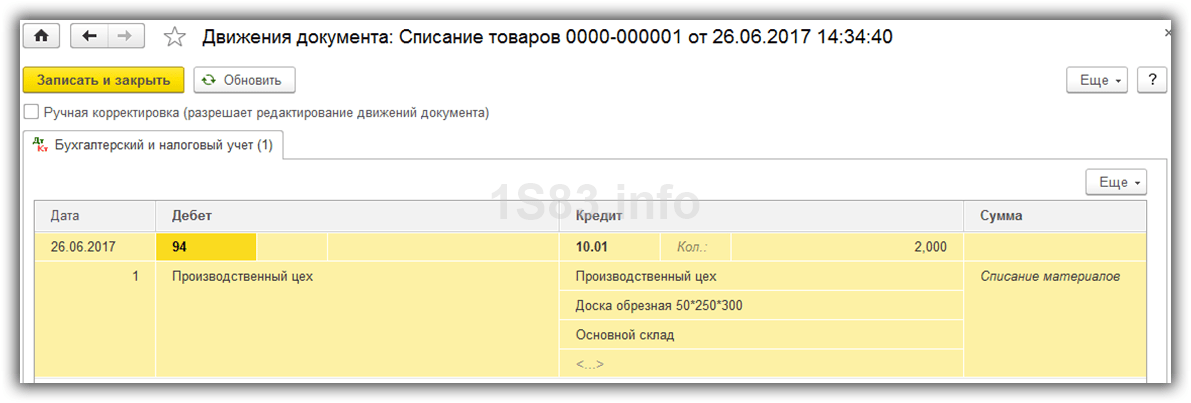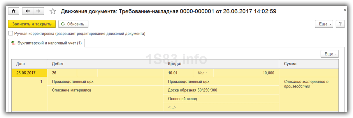 После того, как вы заполнили документ, проведите его. Вследствие этого сформировалась проводка, списывающая материалы в производство по указанным нами в табличной части счетам: