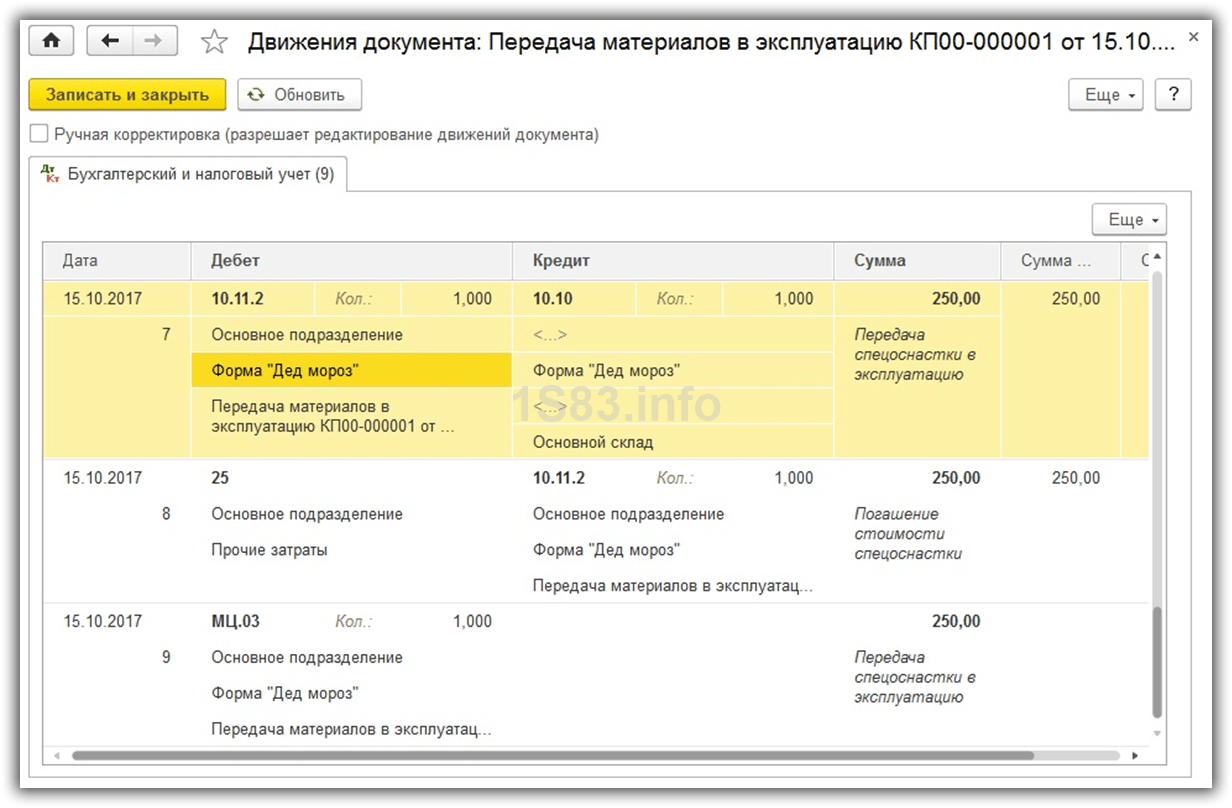 Проведем документ. Сделаны проводки бухучета: Дт 10.11.2 Кт 10.10 (отражена передача в эксплуатацию) и Дт МЦ.03 (забалансовый счет для спецоснастки в эксплуатации).