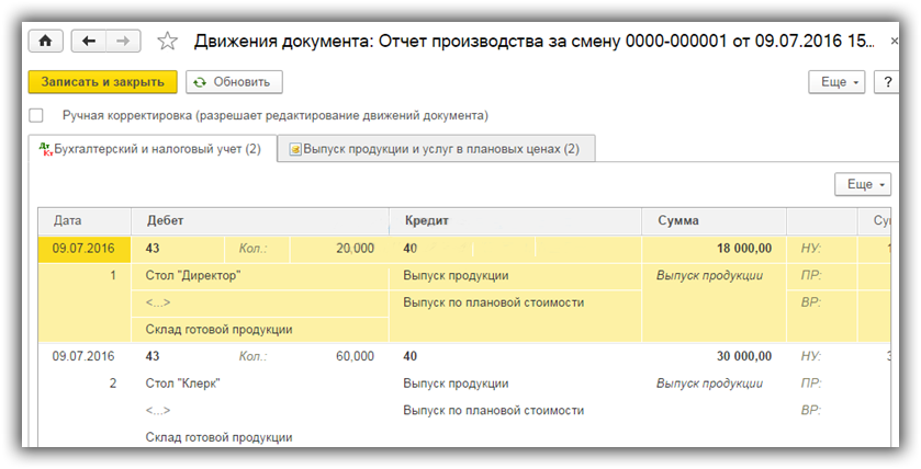 Отражение выпуска готовой продукции производится «Отчетом производства за смену» точно так же, как и в первом примере. После проведения документ делает проводки бухучета Дт 43 Кт 40 на величину плановой себестоимости продукции:
